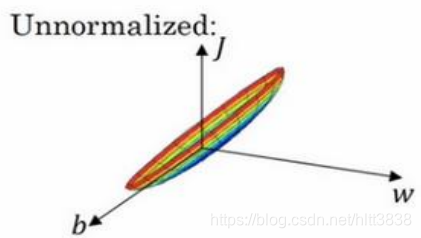 这是一个非常细长狭窄的代价函数,你要找的最小值应该在这里。但如果特征值在不同范围,假如𝑥 1 取值范围从 1 到 1000 ,特征 𝑥 2 的取值范围从 0 到 1 ,结果是参数 𝑤1和𝑤2 值的范围或比率将会非常不同,这些数据轴应该是𝑤 1 和 𝑤 2 ,但直观理解,我标记为 𝑤 和 𝑏 ,代价函数就有点像狭长的碗一样,如果你能画出该函数的部分轮廓,它会是这样一个狭长的函数。