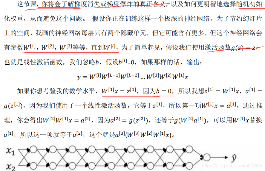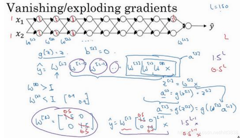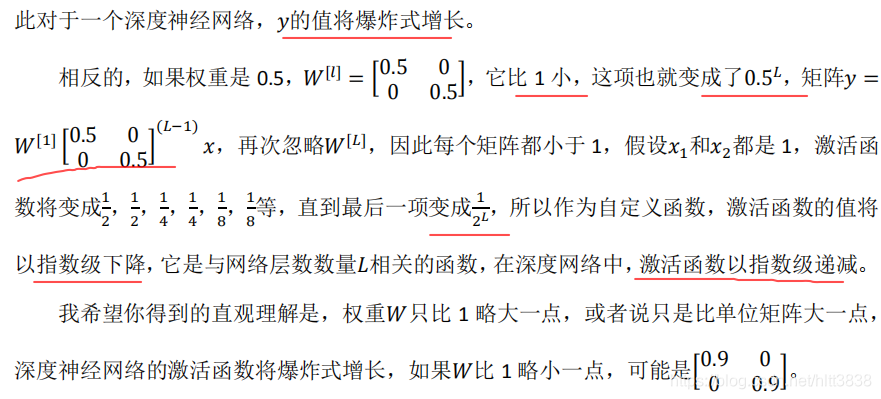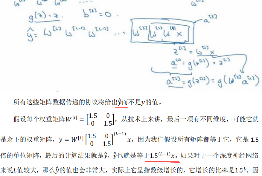 在深度神经网络中,激活函数将以指数级递减,虽然我只是讨论了激活函数以与 𝐿 相关的指数级数增长或下降,它也适用于与层数𝐿 相关的导数或梯度函数,也是呈指数级增长或 呈指数递减。