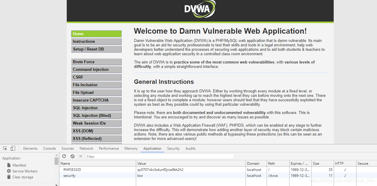 F12键,修改当前浏览器的cookie,然后刷新访问DVWA的index.php页面,就能以管理员的身份进入,如下图