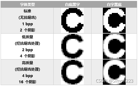在前面章节介绍字体的时候讲解过2bpp和4bpp字体显示效果,下面再给大家展示下不使用抗锯齿和使用2bpp,4bpp两种抗锯齿下字母C的显示效果: