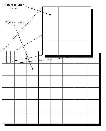 借助STemWin的高分辨率功能,大家就可以使用由抗锯齿因子和显示尺寸决定的虚拟空间。使用高分辨率坐标的优势在于图形不但可以置于显示器的每个点阵像素上,而且可以置于每个点阵像素内部。下图展示的是一个高分辨率像素的虚拟空间,其抗锯齿因子为3: