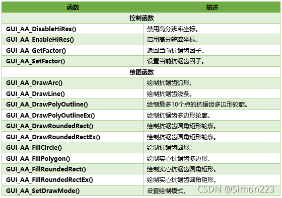 另外特别注意,使用高分辨率坐标必须通过函数GUI_AA_EnableHiRes()进行使能,如果需要禁止可以调用函数GUI_AA_DisableHiRes()来实现。