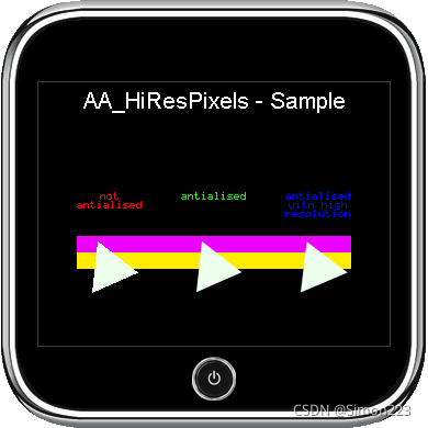 什么称之为锯齿和抗锯齿呢?比如线条是由一系列位于显示坐标处的像素近似构成,可能看起来呈锯齿状,尤其是近似的水平线或近似的垂直线,这种现象称为锯齿(aliasing)。而抗锯齿是对线条和曲线进行平滑处理,降低锯齿感。emWin支持抗锯齿效果的2D图形绘制,抗锯齿字体和高分辨率坐标。