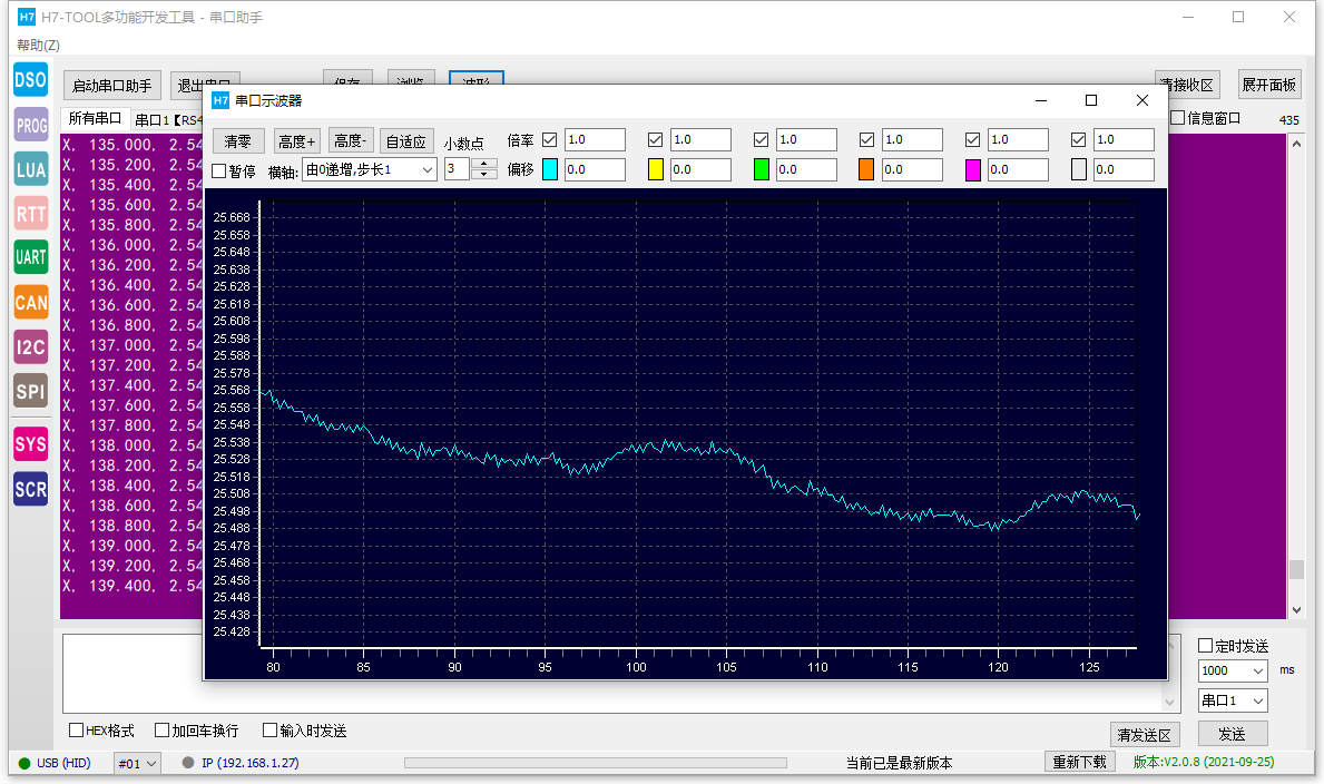 操作比较简单,半角逗号作为不同路波形区分,所有路波形结束加\r\n,当前支持6路波形数据打印,下面是单路展示:
