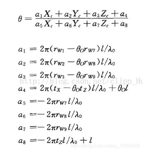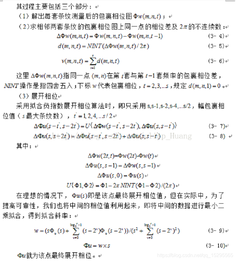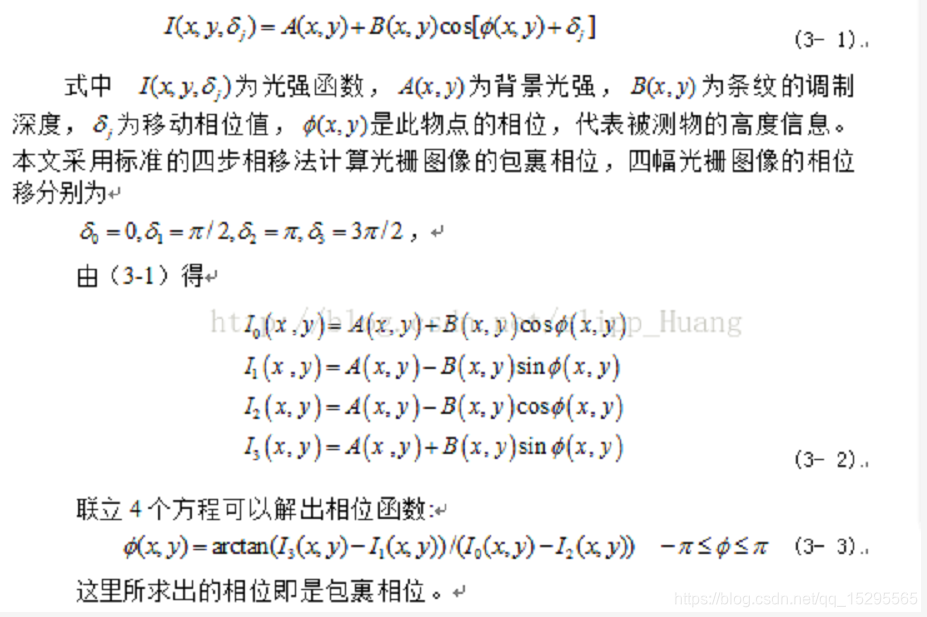 在进行展开相位前,必须先获得每点的包裹相位,其中最成熟最可靠的算法是相移法,该方法已经实现了商品化。相移法[的最大优点还在于求解物体初相位时是点对点的运算,即在原理上某一点的相位值不受相邻点光强值的影响,从而避免了物面反射率不均匀引起的误差。其基本思想是:将一个光强分布呈正弦变化的光栅作为面结构光投影到被测工件表面,所探测的正弦光栅受被测物体表面高度调制产生的光强函数可以用下式表示: (公式不好编辑,只好截图了)