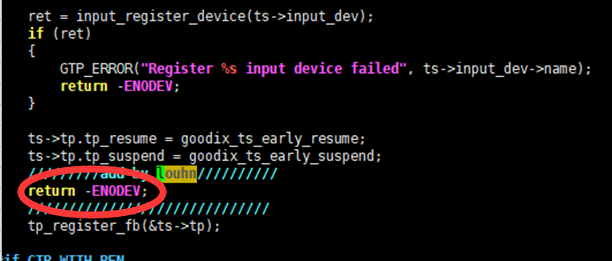 在这里加了个return,原因是因为执行tp_register_fb(&ts->tp);函数后会死机,具体原因还未查