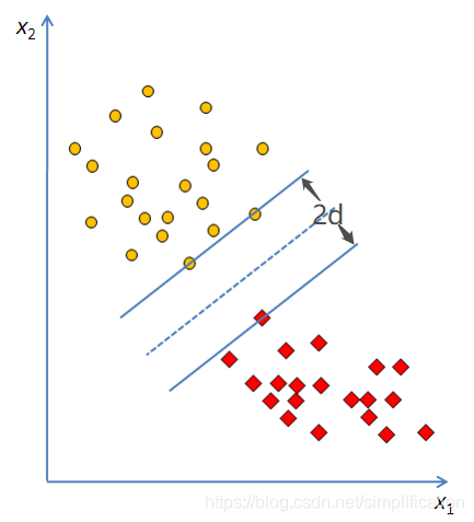 回到二维问题,令“马路宽度”为2d,即最佳分割线到两类支持向量的距离均为d,最佳分割线参数的求解目标就是使d最大。