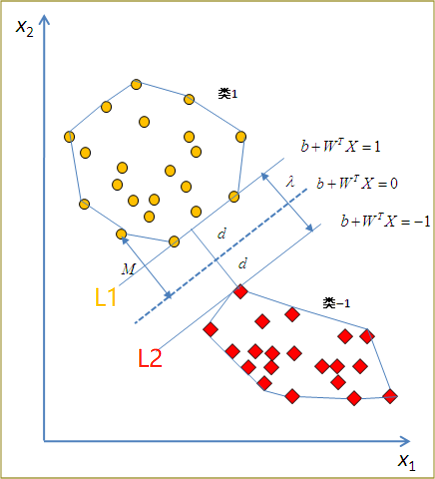 假设L1是其中一条过+1类支持向量且平行于 W X + b = 0 WX+b=0 WX+b=0的直线,L2是过-1类支持向量且平行于 W X + b = 0 WX+b=0 WX+b=0的直线,这L1和L2就确定了这条马路的边边,L是马路中线。