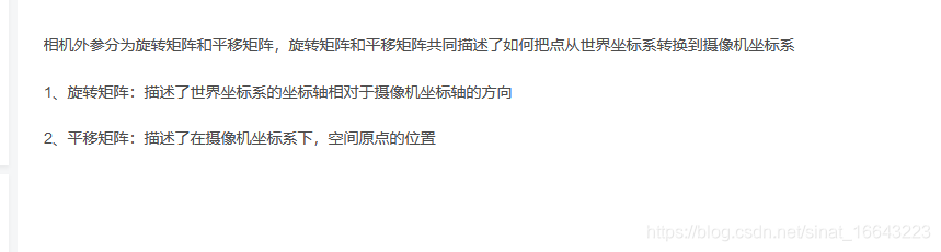 外参呢,就是平移矩阵和旋转矩阵,两个坐标系之间的关系就可以用平移矩阵加旋转矩阵描述嘛,和tf一样,这个我之前总结过对吧。