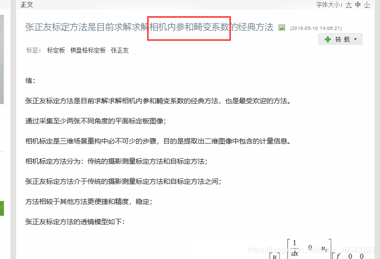 这里说了相机内参包括内参矩阵和畸变参数矩阵!!!!!这样就好理解说得通了。