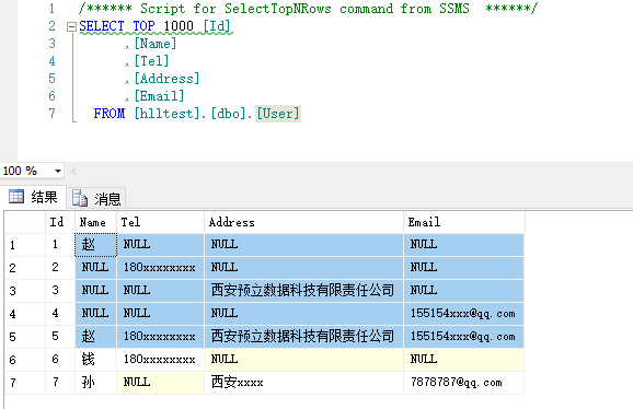 DECLARE @name NVARCHAR(50) = '赵',@Tel NVARCHAR(50) = '180xxxxxxxx',@Address NVARCHAR(50) = '西安预立数据科技有限责任公司',@Email NVARCHAR(50) = '155154xxx@qq.com'SELECT TOP 1000 [Id],[Name],[Tel],[Address],[Email]FROM [hlltest].[dbo].[User]WHERE ISNULL(name,@name) = @nameAND ISNULL(Tel,@Tel) = @TelAND ISNULL(Address,@Address) = @AddressAND ISNULL(Email,@Email) = @Email