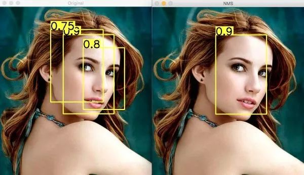 为了保证物体检测的召回率,在Faster RCNN或者SSD网络的计算输出中,通常都会有不止一个候选框对应同一个真实物体。如下图左图是人脸检测的候选框结果,每个边界框有一个置信度得分(confidence score),如果不使用非极大值抑制,就会有多个候选框出现。右图是使用非极大值抑制之后的结果,符合我们人脸检测的预期结果。