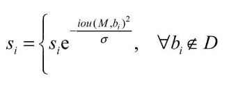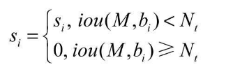 但是,上式并不是一个连续的函数,当一个边框与M的重叠IoU超过阈值Nt时,其得分会发生跳变,这种跳变会对检测结果产生较大的波动。