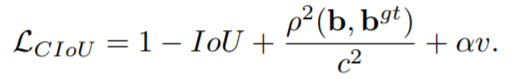 其中,  ,  分别代表了预测框和真实框的中心点,且  代表的是计算两个中心点间的欧式距离。  代表的是能够同时包含预测框和真实框的最小闭包区域的对角线距离。