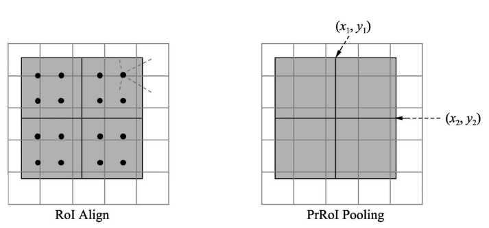 以此为出发点,IoU-Net提出了PrRoI Pooling方法,采用积分的方式实现了更为精准的感兴趣区域池化,如下图中的右图所示。