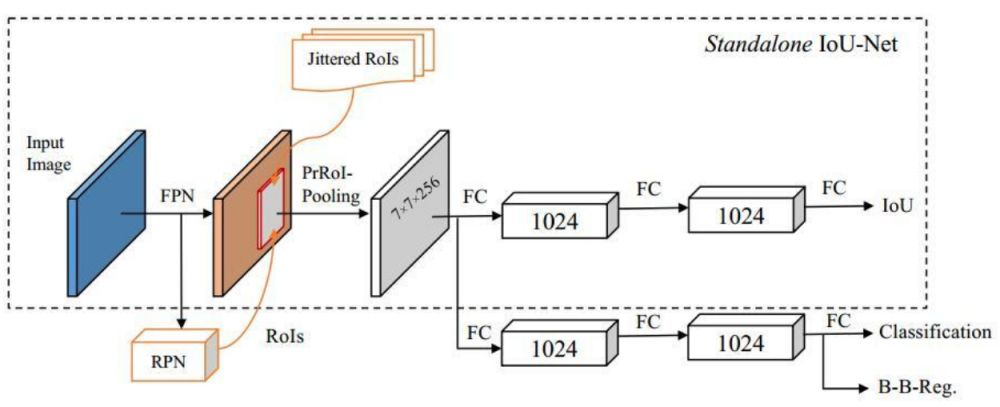IoU-Net的基础架构与原始的Faster RCNN类似,使用了FPN方法作为基础特征提取模块,然后经过RoI的Pooling得到固定大小的特征图,利用全连接网络完成最后的多任务预测。