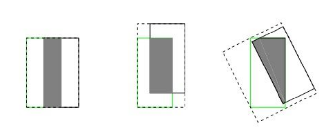 2.IoU无法精确的反映两者的重合度大小。如下图所示,三种情况IoU都相等,但看得出来他们的重合度是不一样的,左边的图回归的效果最好,右边的最差。