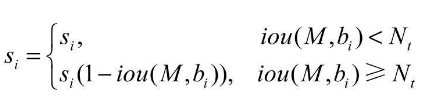 从公式中可以看出,利用边框的得分与IoU来确定新的边框得分,如果当前边框与边框M的IoU超过设定阈值Nt时,边框的得分呈线性的衰减。