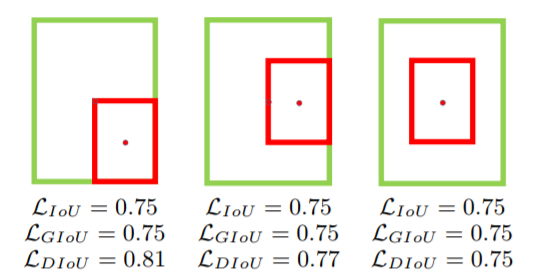 显然从图中可以看出,最右边的图是最理想的预测框情况,然而IoU或者GIoU计算的这三者的值是相等的,所以GIoU的刻画还是无法找到一些最优情况。因此作者提出了DIoU。