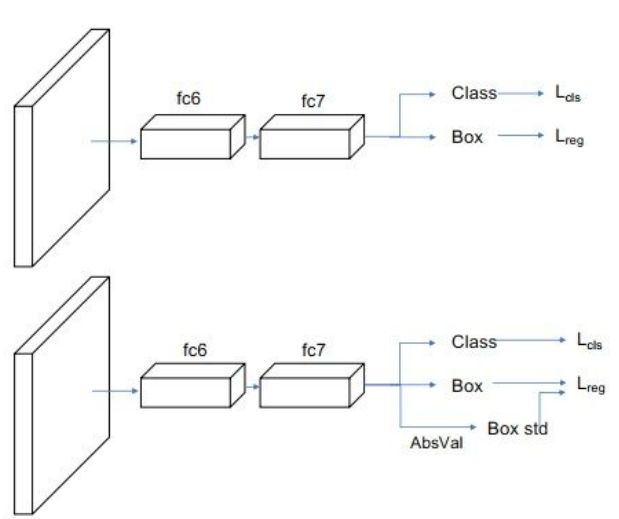 为了描述边框的预测分布,除了预测位置之外,还需要预测边框的标准差。Softer NMS在原Fast RCNN预测的基础上,增加了一个标准差预测分支,从而形成边框的高斯分布,与边框的预测一起可以求得KL损失。