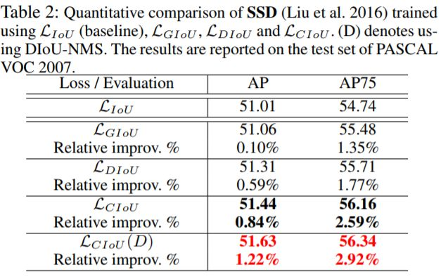 将上述提出的DIoU和CIoU应用到上述的单阶段网络,可以看出,相比较而言,改进的损失都有了一定的提升。特别是阈值为0.75的时候更加的明显。