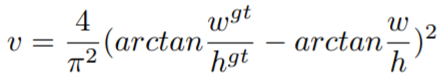 上述CIoU主要是在DIoU的基础上,加入了宽和高的比值,将第三个要素宽高比也加入进来,具体的,多了 这两个参数。其中 是用来平衡比例的系数, 是用来衡量Anchor框和目标框之间的比例一致性。