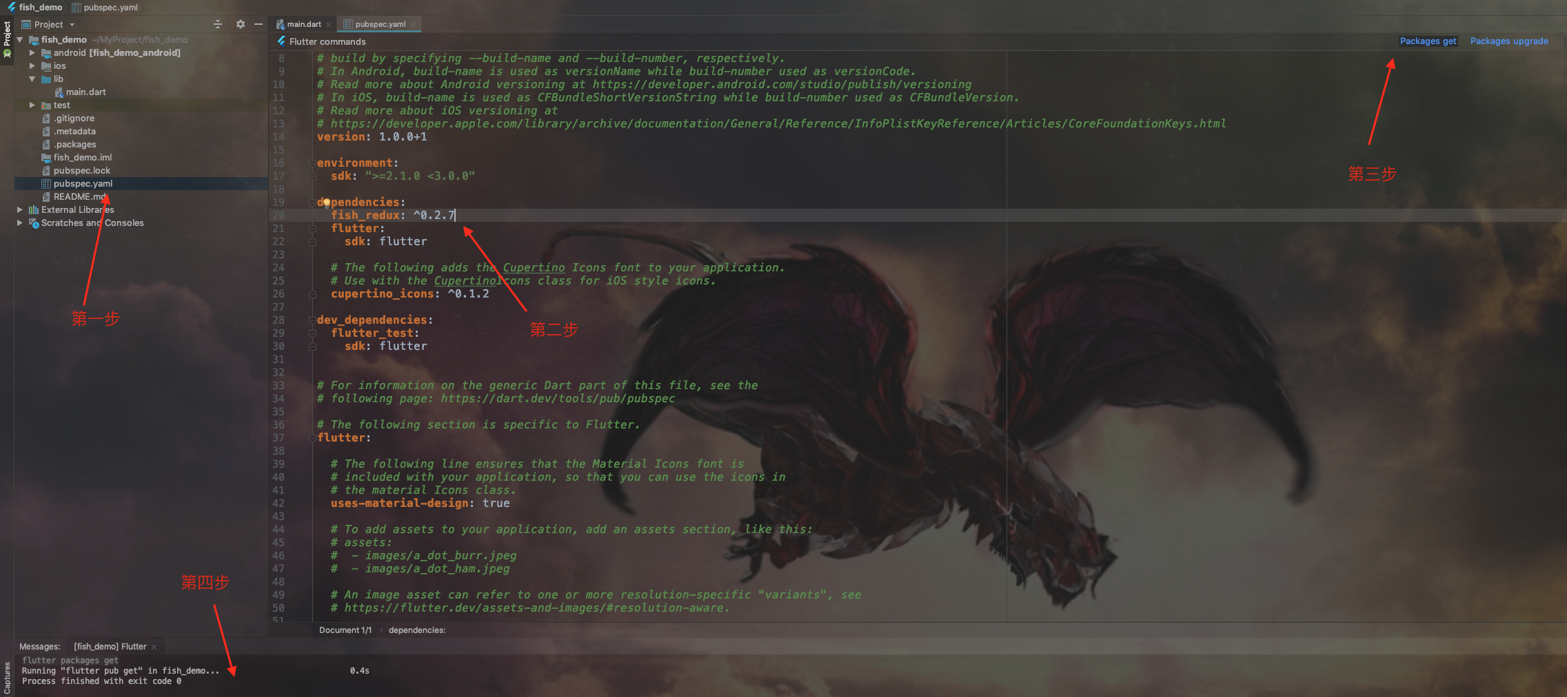 然后我们引入fish-redux:首先打开pubspec.yaml文件,在 dependencies 下面加上 fish_redux: ^0.2.7 ,点击 packages get ,最后查看结果。