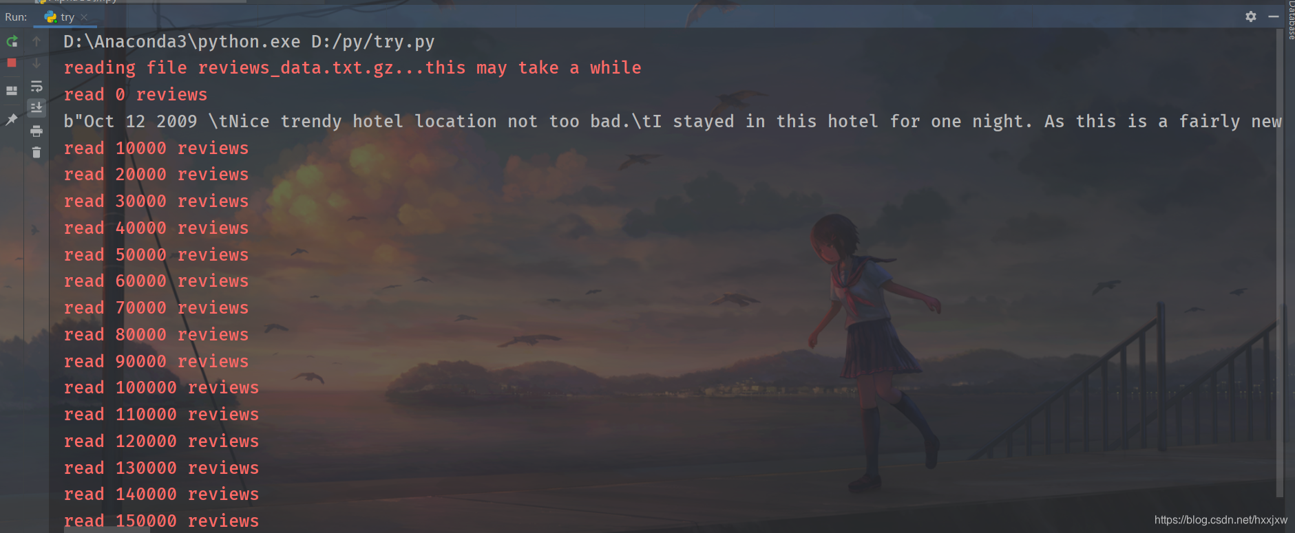 import gzip import gensim import logging#logging格式设置 logging.basicConfig(format="", level=logging.INFO)#解压我们的数据 data_file = "reviews_data.txt.gz"with gzip.open(data_file,'rb') as f:for i, line in enumerate(f):print(line)break#--------------下一步需要把读的数据变为gensim的输入------------------------#把gzip文件的内容读入到list def read_input(input_file):logging.info("reading file {0}...this may take a while".format(input_file))with gzip.open(input_file,'rb') as f:for i, line in enumerate(f):if(i%10000 == 0):logging.info("read {0} reviews".format(i))#做预处理,每个review返回一个单词列表yield gensim.utils.simple_preprocess(line)documents = list(read_input((data_file))) logging.info("Done reading data file") print(documents)