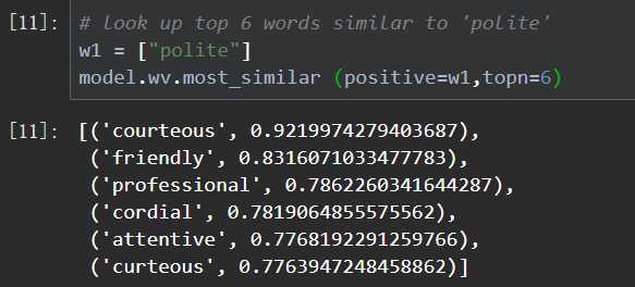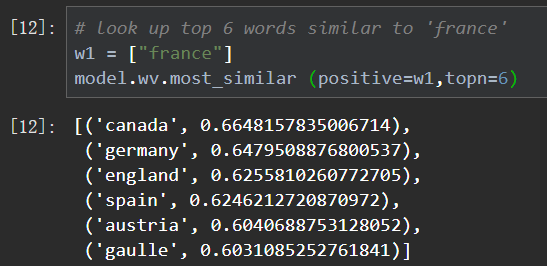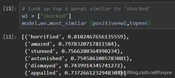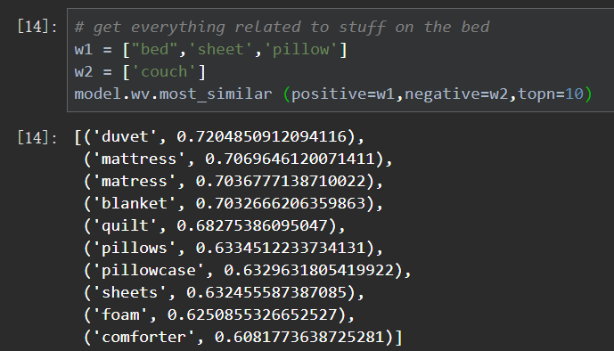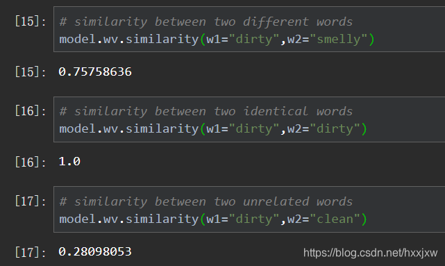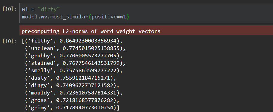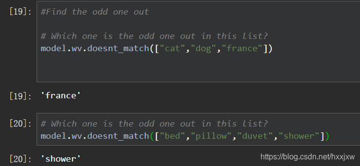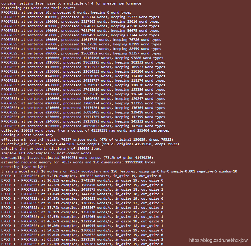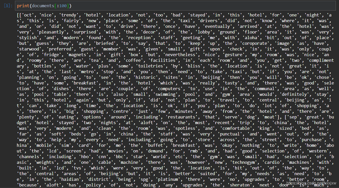 import gzip import gensim import logging#logging格式设置 logging.basicConfig(format="", level=logging.INFO)#解压我们的数据 data_file = "reviews_data.txt.gz"with gzip.open(data_file,'rb') as f:for i, line in enumerate(f):print(line)break#--------------下一步需要把读的数据变为gensim的输入------------------------#把gzip文件的内容读入到list def read_input(input_file):logging.info("reading file {0}...this may take a while".format(input_file))with gzip.open(input_file,'rb') as f:for i, line in enumerate(f):if(i%10000 == 0):logging.info("read {0} reviews".format(i))#做预处理,每个review返回一个单词列表yield gensim.utils.simple_preprocess(line)documents = list(read_input((data_file))) logging.info("Done reading data file") # print(documents)#--------------训练我们的model-------------model = gensim.models.Word2Vec(documents, size=150,window=10, min_count=2,workers=10)#不加这句,光上面那句也能训练,这句是给训练的时候规定一些参数,比如epochs,这里规定了10,如果不规定默认是5的 model.train(documents,total_examples=len(documents), epochs=10)#------------验证我们的结果-------------------- w1 = "dirty" print(model.wv.most_similar(positive=w1))# look up top 6 words similar to 'polite' w1 = ["polite"] print(model.wv.most_similar (positive=w1,topn=6))# look up top 6 words similar to 'france' w1 = ["france"] print(model.wv.most_similar (positive=w1,topn=6))# look up top 6 words similar to 'shocked' w1 = ["shocked"] print(model.wv.most_similar (positive=w1,topn=6))# get everything related to stuff on the bed w1 = ["bed",'sheet','pillow'] w2 = ['couch'] print(model.wv.most_similar (positive=w1,negative=w2,topn=10))# similarity between two different words print(model.wv.similarity(w1="dirty",w2="smelly"))# similarity between two identical words print(model.wv.similarity(w1="dirty",w2="dirty"))# similarity between two unrelated words print(model.wv.similarity(w1="dirty",w2="clean"))#Find the odd one out# Which one is the odd one out in this list? print(model.wv.doesnt_match(["cat","dog","france"]))# Which one is the odd one out in this list? print(model.wv.doesnt_match(["bed","pillow","duvet","shower"]))