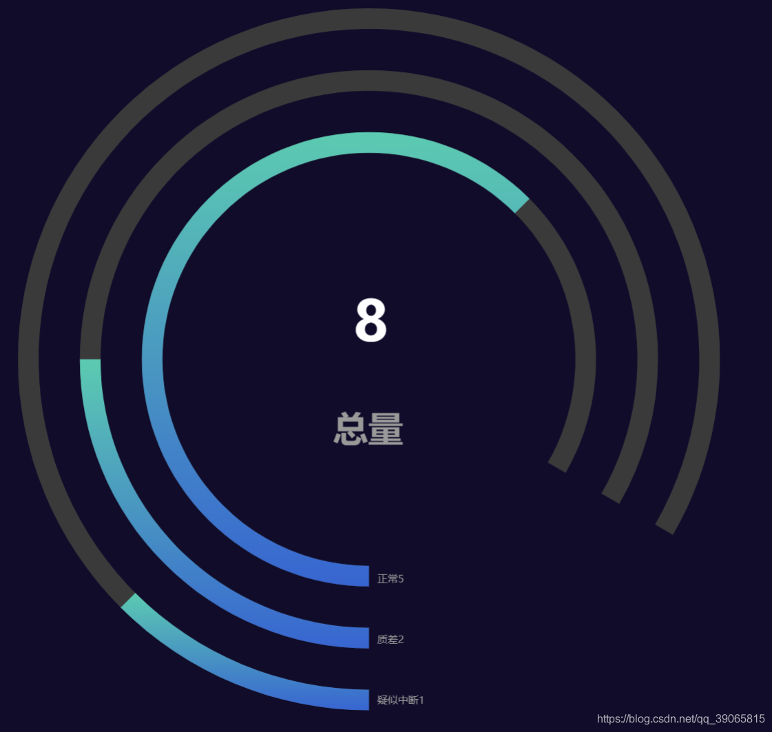 chartData.forEach((v, i) => {pieSeries.push({name: '图表',type: 'pie',startAngle: 270,clockwise: true,emphasis: {scale: false,},radius: [55 + i * 15 + '%', 50 + i * 15 + '%'],center: ['50%', '50%'],label: {show: false,},data: [{value: v.value,name: v.name,},{value: sum - v.value,name: '',itemStyle: {color: 'rgba(0,0,0,0)',},},],});pieSeries.push({name: '',type: 'pie',silent: true,z: 1,startAngle: 270,clockwise: true, //顺时加载emphasis: {scale: false, //鼠标移入变大},radius: [55 + i * 15 + '%', 50 + i * 15 + '%'],center: ['50%', '50%'],label: {show: false,},data: [// 底层圆{value: 10,itemStyle: {color: '#3A3A3A',},},// 空白部分{value: 2,name: '',itemStyle: {color: 'rgba(0,0,0,0)',},},],});lineYAxis.push({value: i,});