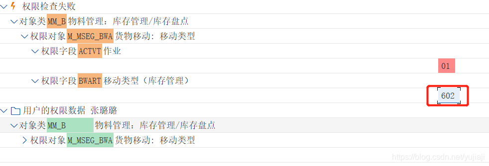 解决方式:出现错误提示,用su53检查下权限问题,是不是缺少601 602 的移动类型权限。根据su53提示去增加相应的权限。