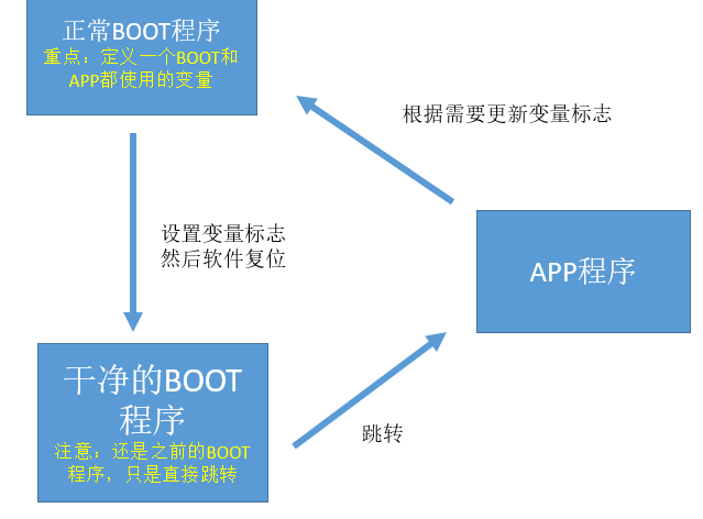 框图含义:我们的正常BOOT里面有各种操作,跳转前逐个复位太繁琐,经常会有各种遗漏没考虑到,特别是BOOT里面用到了,APP也用到的外设。