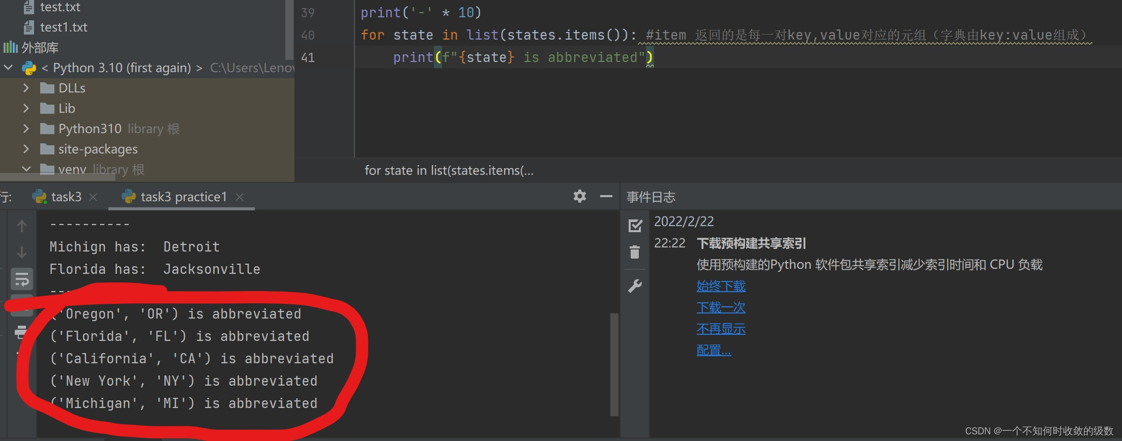 (ps.只有一个变量接收值的情况下,直接返回的是每一对key,value对应的元组。举个例子,for state, abbrev变成for state,结果如下。)
