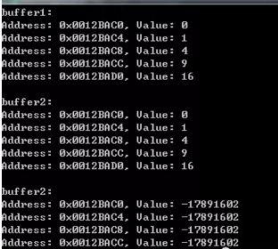 #define BUFFER_SIZE 5int *buffer1 = (int*)malloc(BUFFER_SIZE * sizeof(int));int *buffer2 = buffer1;for (int i = 0; i < BUFFER_SIZE; i++){buffer1[i] = i*i;}print("buffer1", buffer1, BUFFER_SIZE);print("buffer2", buffer2, BUFFER_SIZE);free(buffer1);buffer1 = NULL;print("buffer2", buffer2, BUFFER_SIZE);system("pause");return 0;
