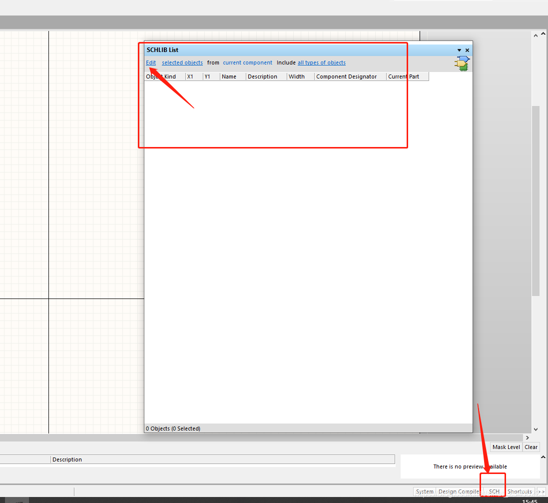 2、 复制EXCLE表格内容,打开AD原理图绘制界面,右下角SCH中找到SCHLIB List,如下所示,将view改成Edit,