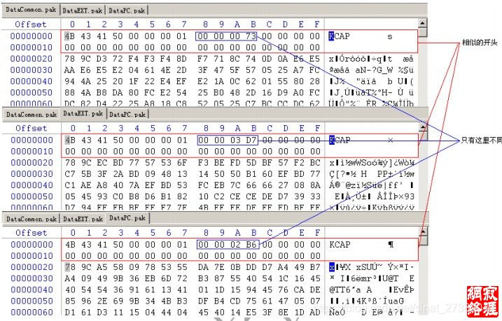 在Datapc文件夹中有三个比较大的pak文件,这三个文件就是游戏的资源包了,也就是我们要解包的对象。在很多情况下?六<文件文件是可以用winrar、好压或者72解压的, 这类PAK文件用WinHex之类的16进制打开后可以发现开头的两个字母都是“PK”,而且右 键菜单中会有用winrar之类的压缩软件解压的选项。但是这个游戏的资源文件不属于这种类型(是的话就不会有这篇文章了)。我们用WinHex打开三个PAK文件,找一下三个文件 的共同特征,首先会发现文件开头部分格式比较相似,都是以“KCAP”四个字母开头,这 应该是这类文件的一个标志,后面是一个hex值为00 00 00 01的双字,用途未知,从偏移0x20开始到0x1f处都是0,只有0x8偏移处的一个双字有所不同,都在偏移0x20处开始有格式比较相同的数据,如图2。