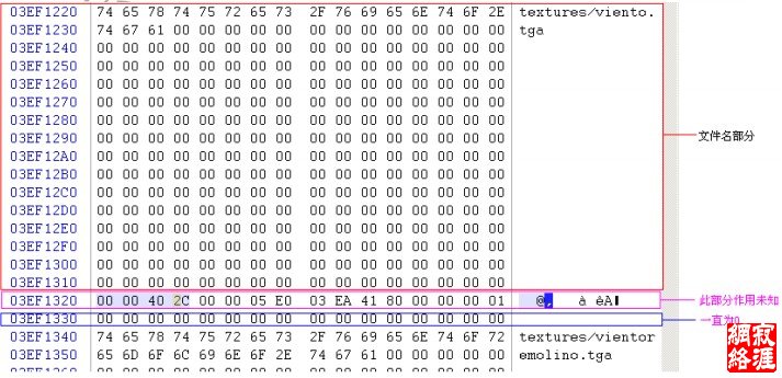 在这里,我们可以假定前面20h个字节的内容为固定的文件头大小,继续往下看,会发 现三个PAK文件都是些以HEX值为78 9C开头的数据块,这些数据块大多数都是长度不定,并以不定数量个0结尾。到了接近末尾的时候,才出现了一些不一样的数据。这些数据中还包括一些可读字符,看起来应该是文件名,而且每隔0\120字节就是下一个文件名,直到文件结束。文件名的后面是长串的0,应该是填充文件名缓冲区的。在从文件名开头往后0x100