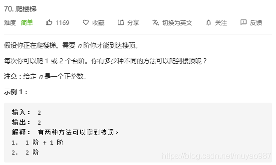 class Solution:# 递归法 超时了def climbStairs1(self, n: int) -> int:if n==1 or n==2:return n# 第1次爬1阶 共climbStairs1(n-1);第1次爬2阶 共climbStairs1(n-2);return self.climbStairs1(n-1)+self.climbStairs1(n-2)# 动态规划(dp)def climbStairs(self, n: int) -> int:dp = [0]*(n+3) # 最短是3个值 防止后面for循环越界dp[0],dp[1],dp[2]=0,1,2for i in range(3,n+1):dp[i]=dp[i-1]+dp[i-2]return dp[n]
