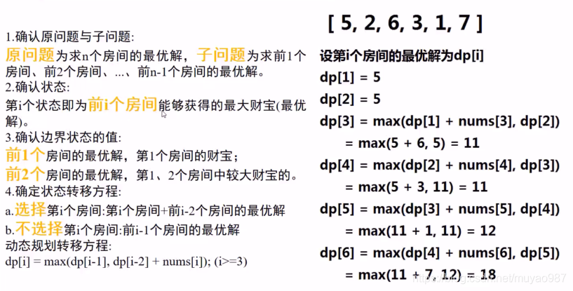 class Solution:def rob(self, nums: List[int]) -> int:if len(nums)==0:return 0if len(nums)==1:return nums[0]if len(nums)==2:return max(nums[0],nums[1])# len(nums) >=3dp = [0]*(len(nums))dp[0],dp[1]=nums[0],max(nums[0],nums[1])for i in range(2,len(nums)):dp[i]=max(dp[i-1], dp[i-2]+nums[i])return dp[-1]