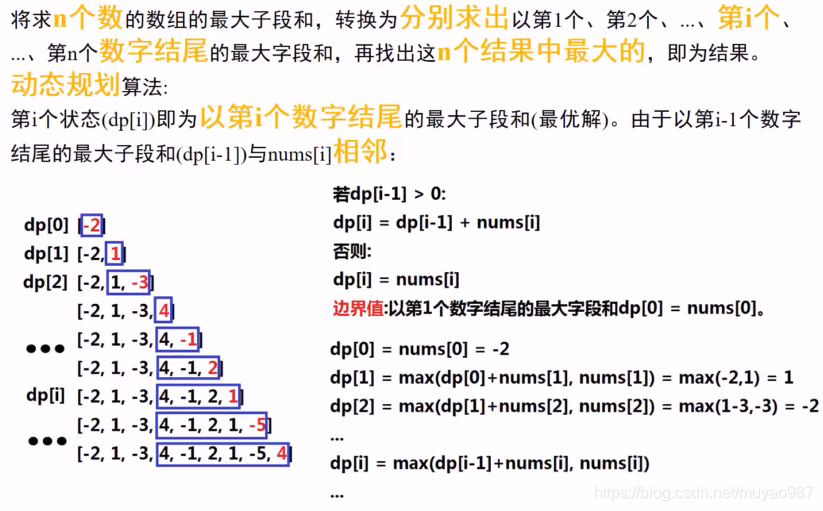 class Solution:def maxSubArray(self, nums: List[int]) -> int:dp = [0]*len(nums)dp[0] = nums[0]max_res = dp[0]for i in range(1, len(nums)):# 以nums[i]为结尾的结果dp[i]=max(dp[i-1]+nums[i], nums[i])if dp[i]>max_res:max_res = dp[i]return max_res