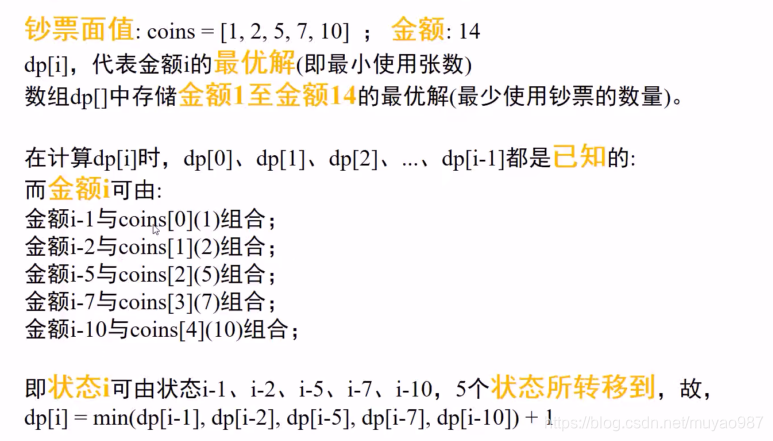 class Solution:def coinChange(self, coins: List[int], amount: int) -> int:# dp[i]是指的组成金额i所需的最少硬币数dp = [-1]*(amount+1)dp[0] = 0# 动态规划 从dp[1]开始递推for i in range(1,amount+1):# 内层循环coinsfor coin in coins:# 若i包含面值coin且i去掉coin后可达if i-coin>=0 and dp[i-coin]!=-1:# dp[i] = min(dp[i-1],dp[i-2],dp[i-5]) + 1 其中1 2 5是面值if dp[i]==-1 or dp[i-coin]+1<dp[i]:dp[i]=dp[i-coin]+1return dp[amount]