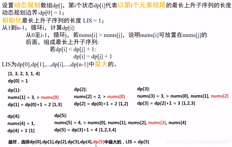 class Solution:def lengthOfLIS(self, nums: List[int]) -> int:if len(nums)==0 or len(nums)==1:return len(nums)# dp[i]表示nums[i]为结尾的最长上升子序列长度 # dp[i+1] = max(dp[0],dp[1],..,dp[i])+1 其中max()里面对应的num都小于nums[i+1]dp = [1]*len(nums)res = 1for i in range(1, len(nums)):for j in range(0,i):if nums[i]>nums[j] and dp[j]+1>dp[i]:dp[i]=dp[j]+1if dp[i]>res:res=dp[i]return res