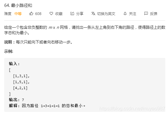 class Solution:def minPathSum(self, grid: List[List[int]]) -> int:if not grid:return 0# 获取行和列m = len(grid)n = len(grid[0])# 初始化dp为全0 形状跟grid一样dp = []for i in range(m):tmp = []for j in range(n):tmp.append(0)dp.append(tmp)# 从左上到右下动态规划dp[0][0] = grid[0][0]# 初始化第0行for i in range(1,n):dp[0][i] = grid[0][i]+dp[0][i-1] # grid[0][i]只能从左边过来# 从第1行开始遍历for i in range(1,m):# 初始化第i行第0列dp[i][0] = grid[i][0]+dp[i-1][0]# 填其他列 要么从左边过来 要么从上边过来for j in range(1,n):dp[i][j]=min(dp[i-1][j],dp[i][j-1])+grid[i][j]return dp[m-1][n-1]