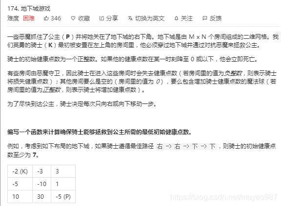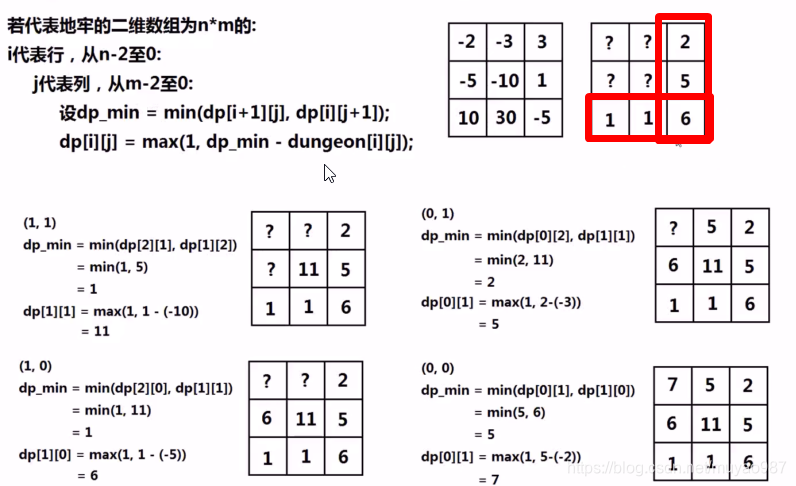 class Solution:def calculateMinimumHP(self, dungeon: List[List[int]]) -> int:if not dungeon:return 0# 获取行和列m = len(dungeon)n = len(dungeon[0])# 初始化dp为全0 形状跟dungeon一样dp = []for i in range(m):tmp = []for j in range(n):tmp.append(0)dp.append(tmp)# 初始化最后一个元素dp[m-1][n-1] = max(1, 1-dungeon[m-1][n-1])# 初始化最后一行0 ~ n-2 个元素for i in range(0,n-1):idx = n-2-idp[m-1][idx] = max(1, dp[m-1][idx+1]-dungeon[m-1][idx])# 初始化最后一列0 ~ m-2 个元素for i in range(0,m-1):idx = m-2-idp[idx][n-1] = max(1, dp[idx+1][n-1]-dungeon[idx][n-1])# print(dp)# 从倒数第2行开始往上遍历 遍历m-2 ~ 0 行, 每行遍历前n-2 ~ 0 列for i in range(0,m-1):row = m-2-ifor j in range(0,n-1):col = n-2-jprint(row,col)dp_min = min(dp[row+1][col],dp[row][col+1]) # 正下方 or 正右方dp[row][col]=max(1, dp_min-dungeon[row][col])# print(dp)return dp[0][0]