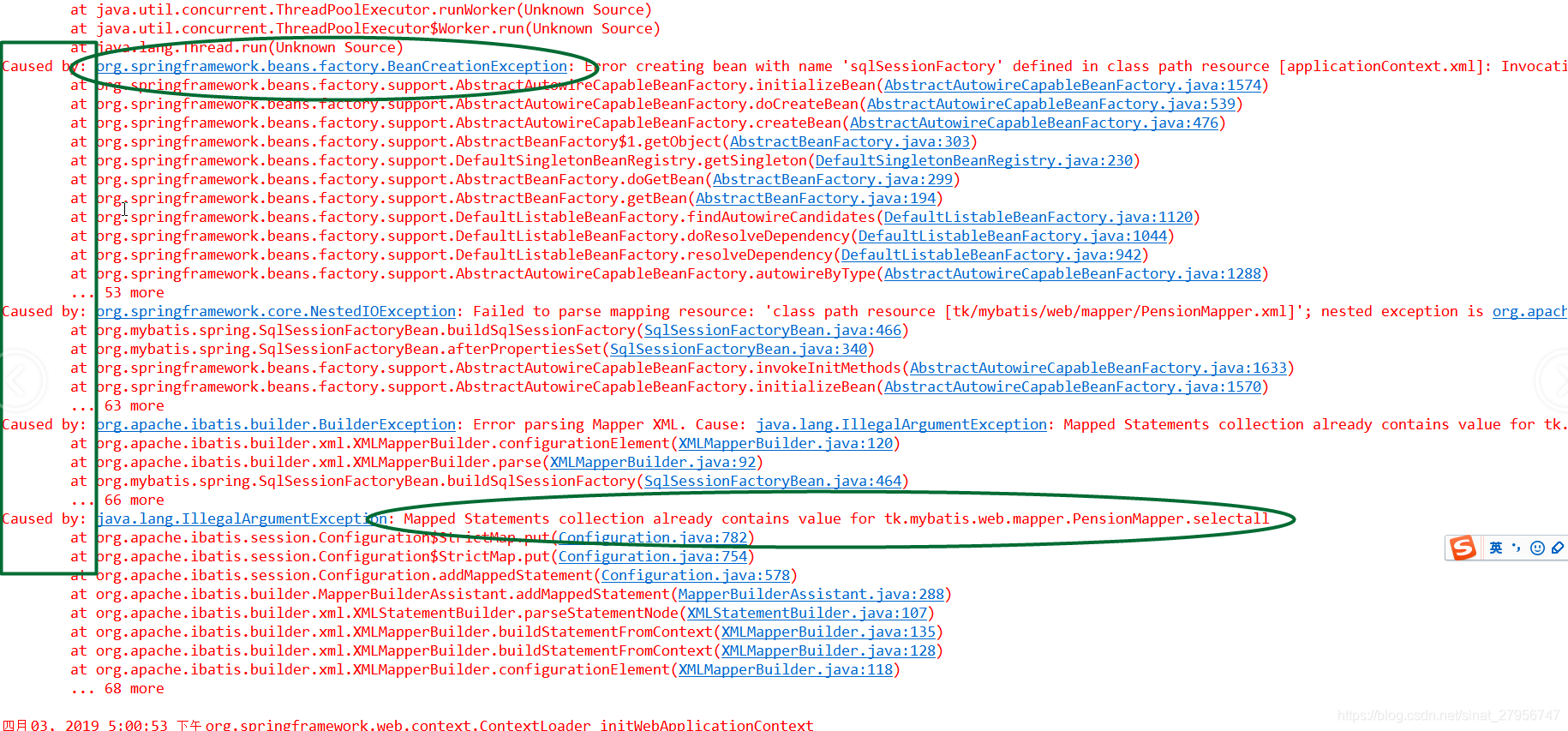 Caused by: org.springframework.beans.factory.BeanCreationException: Error creating bean with name 'sqlSessionFactory' defined in class path resource [applicationContext.xml]: Invocation of init method failed; nested exception is org.springframework.core.NestedIOException: Failed to parse mapping resource: 'class path resource [tk/mybatis/web/mapper/PensionMapper.xml]'; nested exception is org.apache.ibatis.builder.BuilderException: Error parsing Mapper XML. Cause: java.lang.IllegalArgumentException: Mapped Statements collection already contains value for tk.mybatis.web.mapper.PensionMapper.selectall