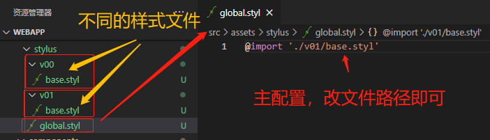 如果一个项目中有不同的样式主题,可以在 vue.config.js 中只引入 global.styl。修改 global.sty 中的引入文件即可。这样就不用重启项目。注意: styl 中也可引入 css 文件。