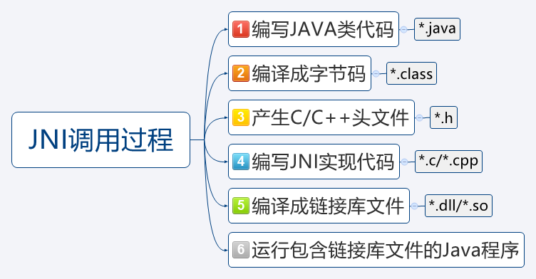 JNI是Java Native Interface的缩写,它提供了若干的API实现了Java和其他语言的通信(主要是C&C++)。JNI调用过程大致如下: