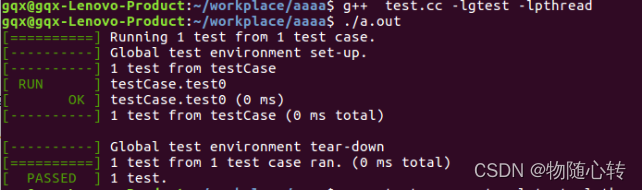 gqx@gqx-Lenovo-Product:~/workplace/aaaa$ g++ test.cc -lgtest -lpthreadgqx@gqx-Lenovo-Product:~/workplace/aaaa$ ./a.out