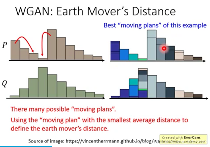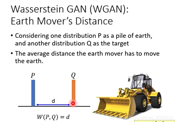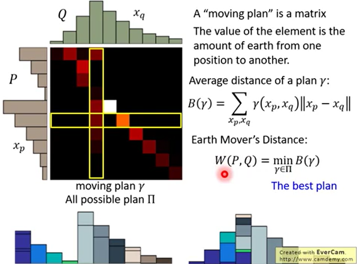 把P这抔土移到Q的平均距离,如果P到Q的distance恒为d,那么Earth Mover’s Distance为1。