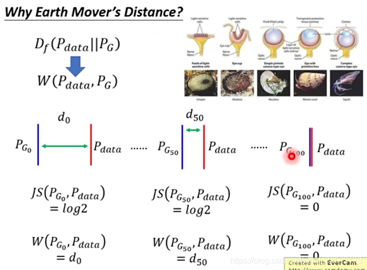 右上角是眼睛的进化过程。下图可以把JS散度过程转为WGAN过程,因此可以迭代成功。